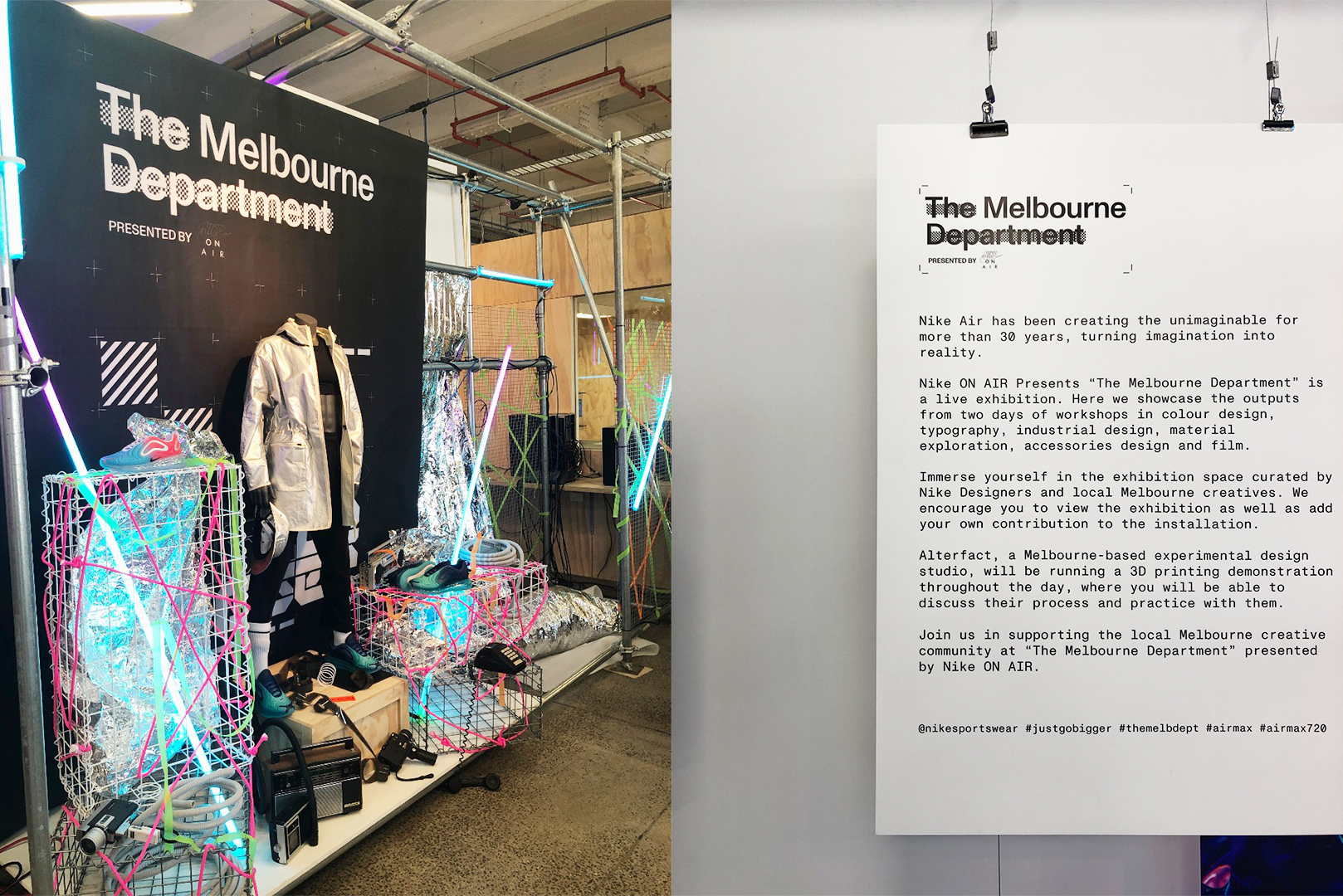 I can totally feel Nike’s energy and vision as I walked into the exhibition. Near the entrance, there was an installation with the sign that says, ‘The Melbourne Department,’ accompanied with a mannequin that showcased Nike outfit and a couple of Nike Air Max 720. “Nike Air has been creating the unimaginable for more than 30 years, turning imagination into reality,” was written on the label.