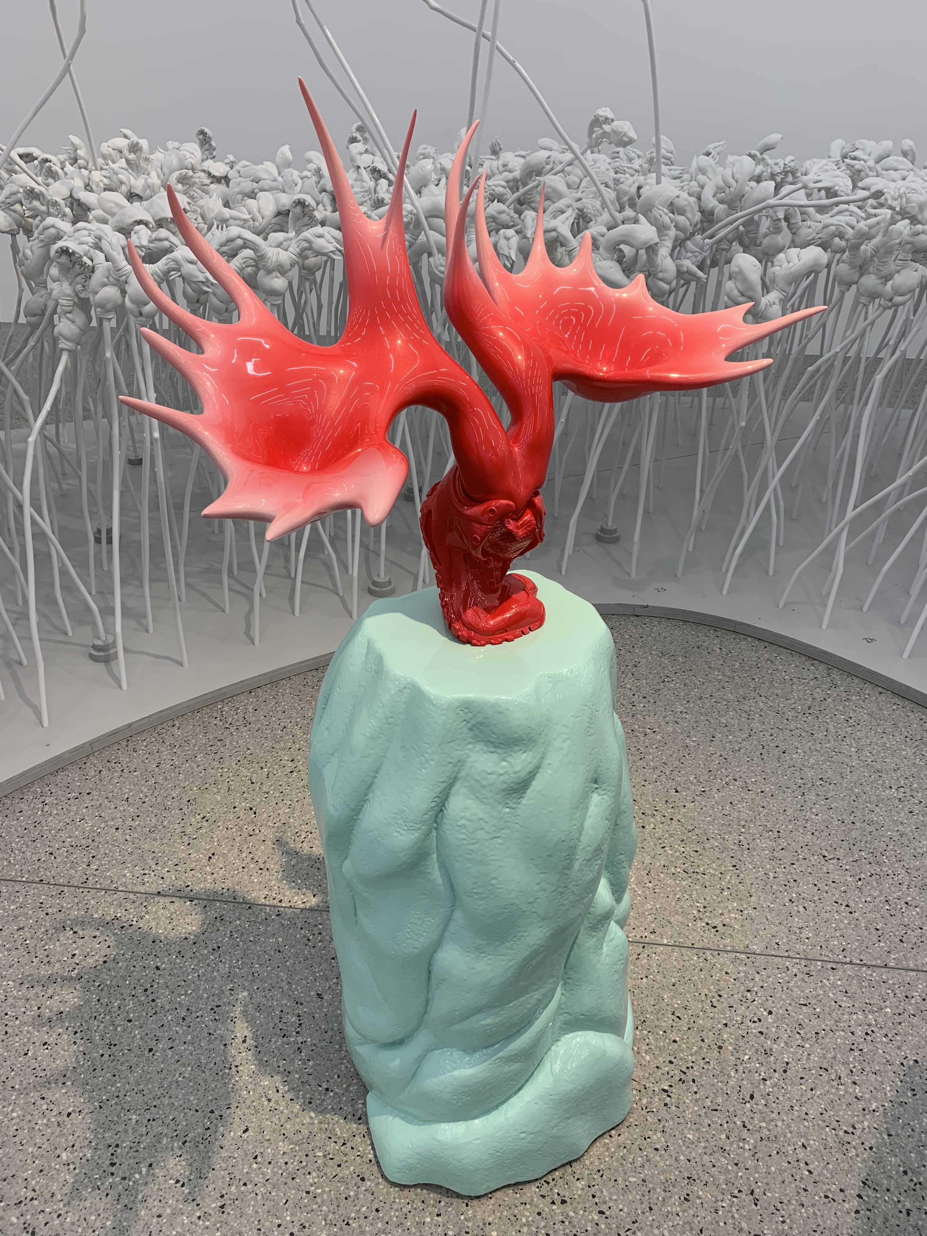 Eerie yet beautiful. These were the first notes I wrote upon entering the “ENTER” exhibition in Kew, newly curated by the Lyon Housemuseum. As I walked through one of the major rooms of the small exhibition I couldn’t help but notice a violin playing faintly in the background, which was surprisingly not intended to be part of the piece that struck my interest the most. It was hard to miss the sculpture that took up a large portion of the space in the room. The piece in question had a boldly coloured pair of red antler-like structures emerging from a red boot, sitting upon a turquoise rock. However, this was only one part of the piece as it sat within a moderately sized walkway in a large, white, field-like environment. However, I couldn’t quite figure out what the field consisted of despite the sculptured figures being incredibly detailed. My initial reaction to this piece was that although it was grand and aesthetically pleasing, I couldn’t identify the underlying meaning. However, upon reading the guide I received on entry the messages became clear.