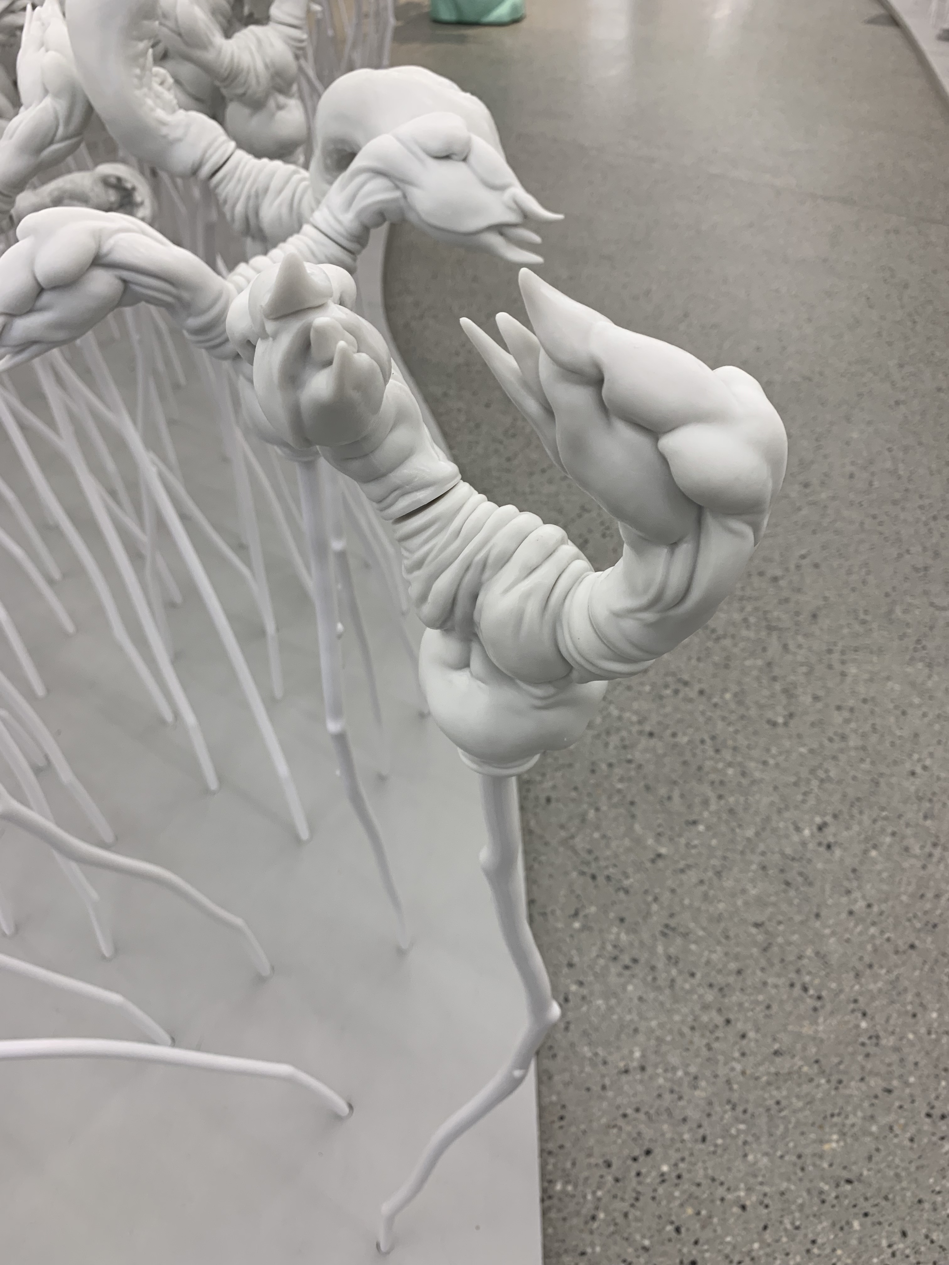 This piece is titled “The Clearing” by Patricia Piccinini, a contemporary Australian Artist and one of the few selected to take part in the ‘ENTER’ exhibition. Piccinini asks her viewers to question the idea of nature within our contemporary world. Her proposition is that we need to have a better understanding of our constantly moving modern world and change the way we think about nature to protect what’s left of it [1]. Piccinini also proposes that the field consists of flowers, all the same yet positioned differently to appear as though they are all different, an attempt to embody how nature is complex despite being represented in a simple environment [2]. These statements allowed me to further my understanding of the underlying connotation, as I initially didn’t have, as Bourdieu states, the ‘cultural competence’ or the ‘code’ to which was required in deciphering the underlying meaning of this piece [3]. What she has stated refers directly to aesthetics, we are focussed on how the piece looks and fail to consider what is being symbolised, to which I am guilty of. An art principle used within “the Clearing” is contrast, commonly represented by using a coloured object within a white space, as it has been used here. In my case, I focussed on the coloured object as it stands out, with the white field being a secondary thought despite it exploiting a large area within the exhibition. This is a metaphor for how we perceive the world, we are so focussed on what is right in front of us, or what is considered materialistic, that we fail to realise what surrounds us, that being nature. ‘Critical designers do not suggest what is the preferable future according to them; they encourage the society to reflect on it’ although Piccinini isn’t suggesting how to effectively improve our focus on nature, she is calling her audience to begin to recognise what is beyond the modernistic world we have become consumed within [4].
