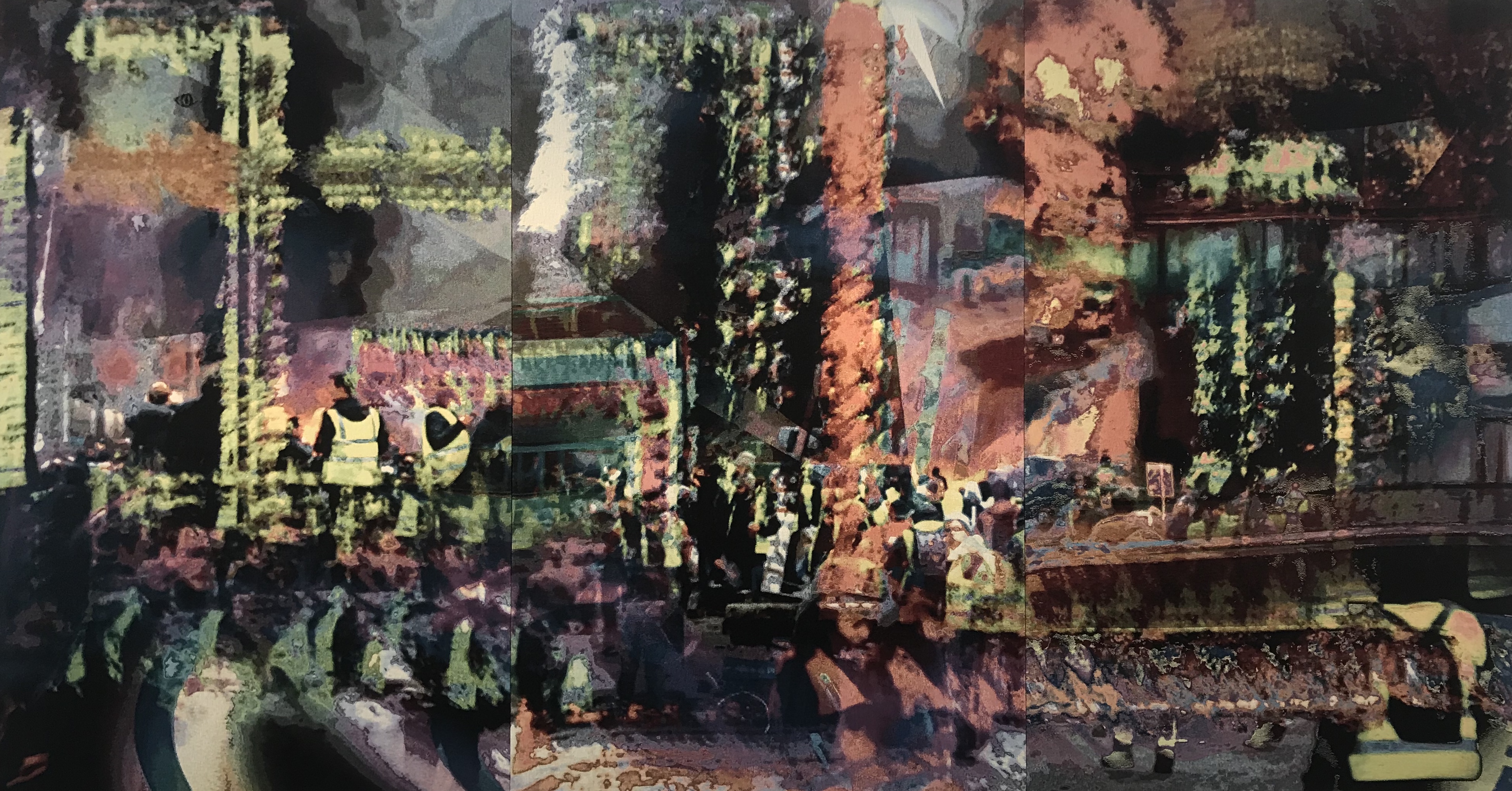 The artwork presents the political movement of yellow vests in France. At first glance, digital manipulation is highly recognisable on the image. Colours are over saturated, light is over exposed on the artwork which reduces details, and some parts of the artwork are blurry. This manipulation creates a chaotic environment which can be barely seen. The manipulation is like a burn effect on the image, which might suggest the violence of the conflict between the government and protestors. What was initially a democratic protest became an anarchic resistance because of the wrong government violence policy on streets.